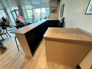 As part of their business expansion, Furniture North East installed a small bar to facilitate coffee roasting workshops. We utilised some of their existing poseur table tops for savings and prepared the frontage ready for our customer to clad themselves.